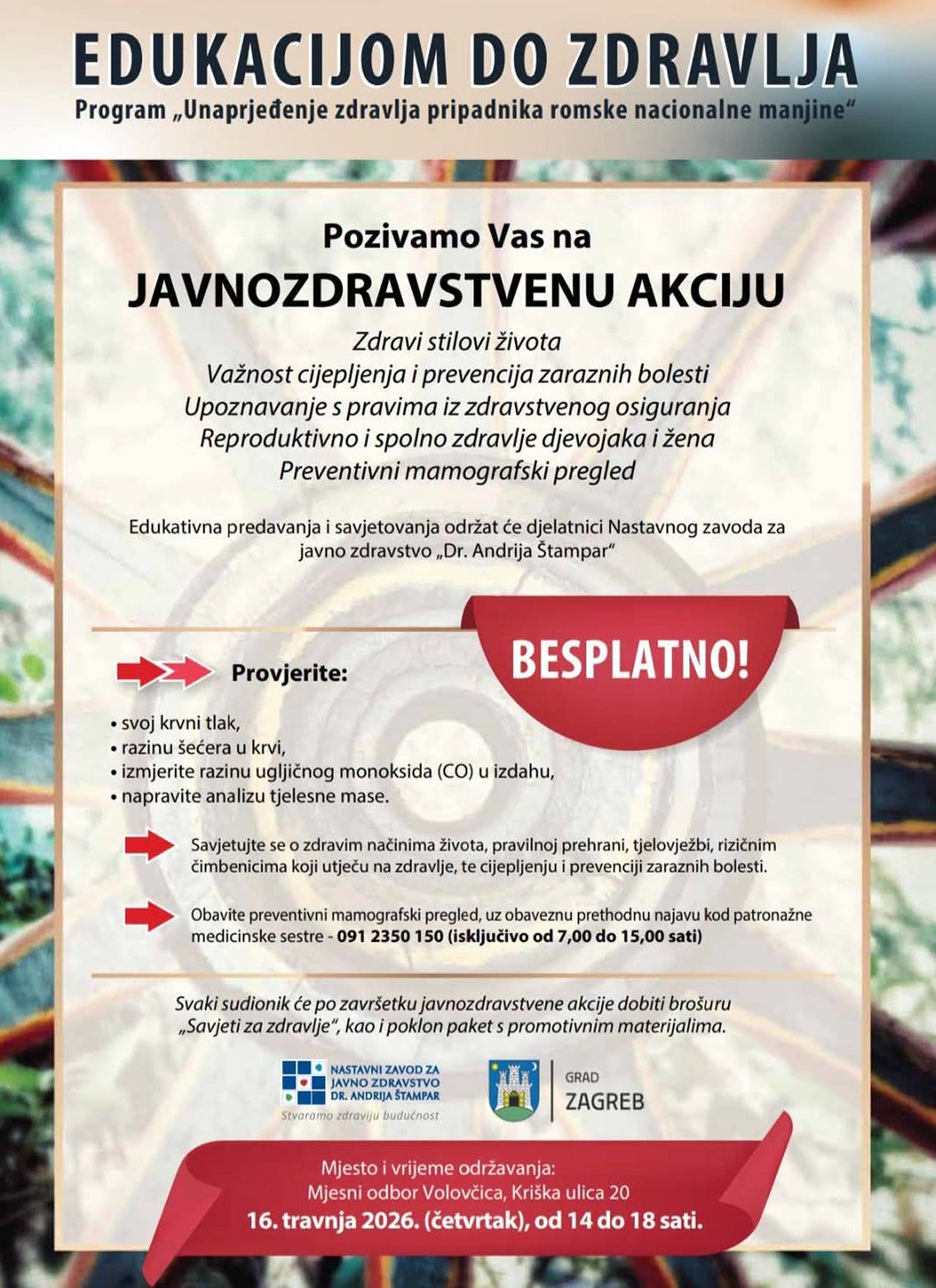 U organizaciji Nastavnog zavoda za javno zdravstvo „Dr. Andrija Štampar“, u suradnji s Vijećima mjesnih odbora Donje Svetice i Volovčica, održat će se javnozdravstvena akcija pod nazivom: